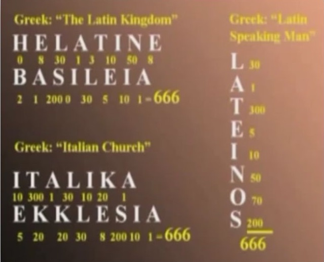 ALL three crowns in the one crown carry with it the title "Vicarius Filli Dei" and the title itself can be counted using the Roman Numeral "letter/number equivalents. (see below) Not only in Latin can this number be derived concerning the Pope of Rome. It can be determined also by the Greek. The titles of "The LATIN KINGDOM", "the ITALIAN CHURCH" and the "LATIN Speaking MAN" all "COUNT the number of the MAN" and the sum is (666) the number of the BEAST.