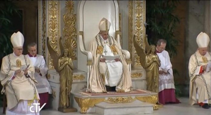 Exo 25:18-20 And thou shalt make two cherubims of gold, of beaten work shalt thou make them, in the two ends of the mercy seat. And make one cherub on the one end, and the other cherub on the other end: even of the mercy seat shall ye make the cherubims on the two ends thereof. And the cherubims shall stretch forth their wings on high, covering the mercy seat with their wings, and their faces shall look one to another; toward the mercy seat shall the faces of the cherubims be. Since these cherubim's are under his feet, and not above him, his signal photo here projects that the haughty Pontiff of Rome is trampling the covenant of God under his feet. Heb 10:29 Of how much sorer punishment, suppose ye, shall he be thought worthy, who hath trodden under foot the Son of God, and hath counted the blood of the covenant, wherewith he was sanctified, an unholy thing, and hath done despite unto the Spirit of grace?