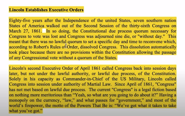 Those in the current corrupt Congress like McConnel and Pelosi knows that what they are doing is illegal and against the Constitution. They also know that YOU DON'T KNOW! Politics in Washington D.C. is a joke and has been now since April of 1861. For 160 years this nation has deceived you into believing it was a legitimate Republic with Democracy and a free country. Is it any wonder then that today's Congress is so fouled up politically and it will never be any different. You cannot place your life in the hands of these deceivers and still maintain any hint of freedom. Take note of the statement above "We've got what it takes to take what you've got" This is exactly what has taken place in the 2020 presidential election. Friends, they took away almost 80 million votes and placed in the Oval Office who they wanted. There has not been a legitimate government in America since 1861 during the Civil War.